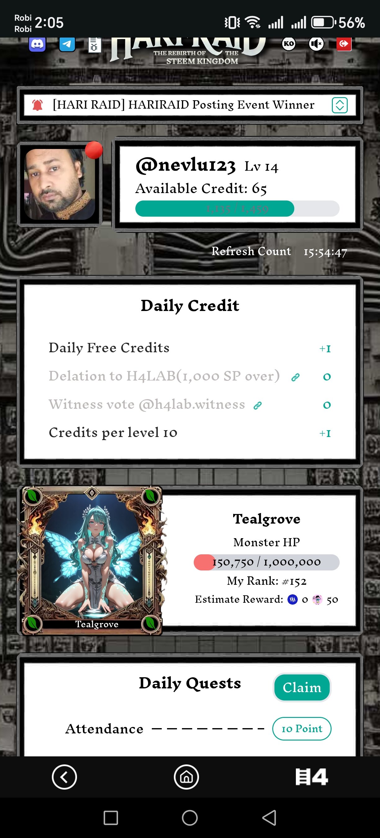 Today my level was 14 also cradit was 65 also monster hp 150750/1000000.Also i claim 10 points.