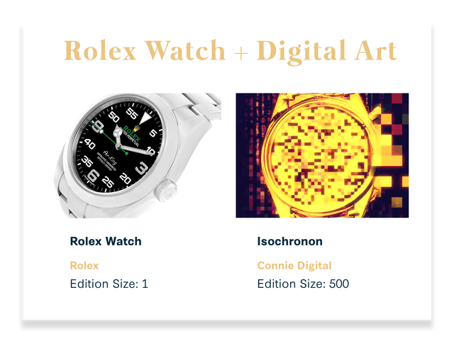 There's an exciting new set of items up for grabs on Portion - the blockchain powered marketplace. This week there's a Rolex watch and an NFT artwork by artist, Connie Digital. This particular pair is a Portion "Drop" - meaning that via purchasing a digital artwork you're automatically entered into a cryptography fueled raffle to earn the IRL physical watch. For 10 USD you can own artwork and might also win a Rolex.