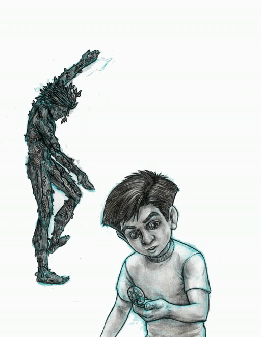 There were other times I combined traditional and digital media to create effects that would otherwise be difficult to create entirely on their own. For example, there were a few cases when I had to draw glowing white objects. To keep the texture of the image consistent, I would draw the "negative" of the image in black pencil and then invert the colors digitally. See the wings of the angel in the two slideshows below.