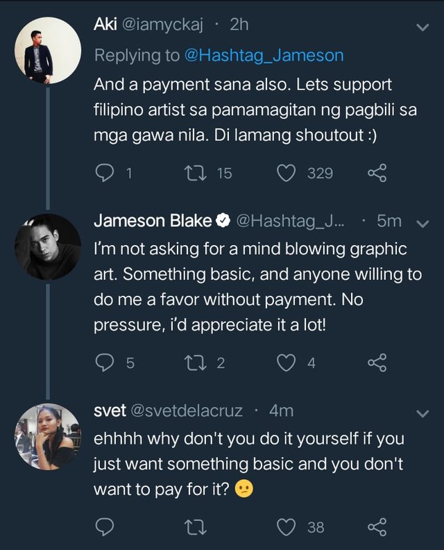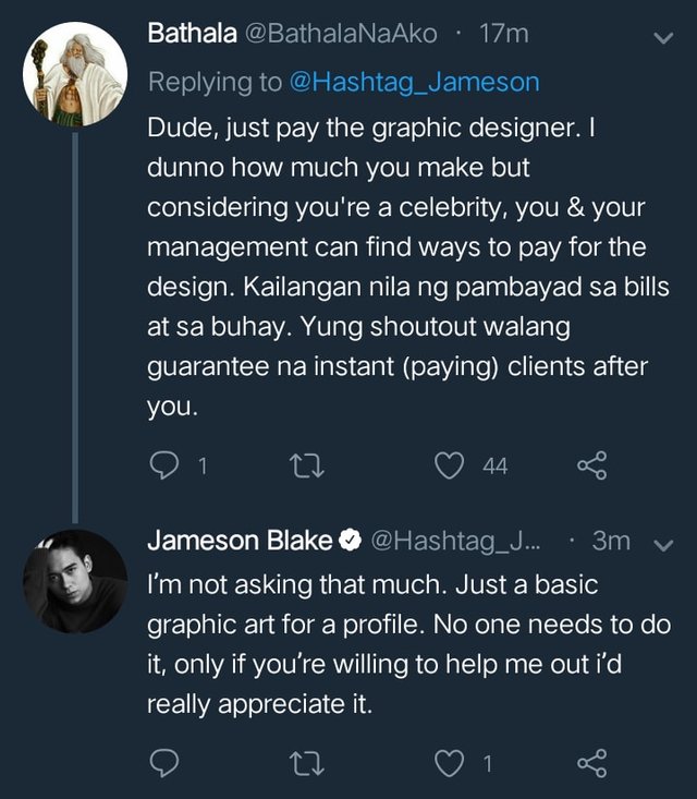 Hindi po nakakatulong na lahat ng gawain mo libre. Dahil meron kapang pamilyang kailangan mo pakainin sa araw-araw. Ang tingin po ng maraming tao na simpleng bagay ang pagiging graphic artist. Marami na po kaming pera nagastusan sa pag-aaral ng graphics-design tapos ito lang ang maiibigay mo sa akin? Libre lang. Huwag mo kaming gaganyanin pre. Kung alam mo lang yung mga paghihirap namin para kumita at mabuhay sa araw-araw. Ang laman siguro ng kukuti ay ang pagmomodelo ang pinakamahirap na trabaho sa buong pilipinas. Tapos tayong mga graphic designers na ang akala niya ciguro parang larong Half-life. Sana po intindihin ninyo na nabubuhos at nagagastos namin yung oras, pera, at sikap dahil ito ay disenteng trabaho. Hindi lang para kay James itong video na ito, para din ito sa mga walang-kaalam pagdating sa ganitong trabaho.
