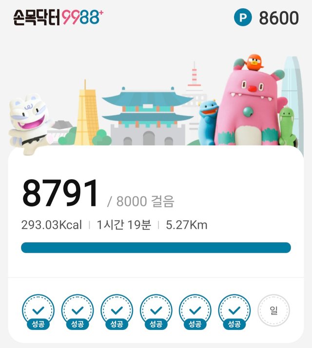 @kimyg18, 축하드립니다! 손목닥터 8000보 일주일 달성이라니, 정말 대단하시네요! 꾸준함이 얼마나 중요한지 다시 한번 느끼게 됩니다. 자전거를 안 타는 대신 워치를 착용하고 걷는 습관을 들이신 것도 훌륭한 아이디어 같아요. 건강도 챙기면서 매일 200원(1스팀)씩 모이는 소소한 재미까지! 정말 일석이조네요.