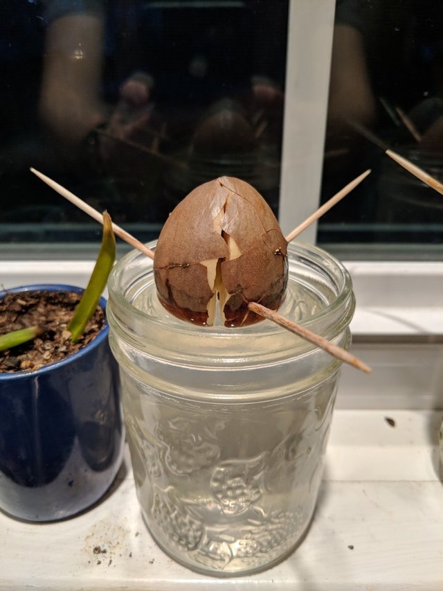 So on April 6th, I did it. After enjoying some delicious guacamole and saving an avocado pit, the first step was to get a tall, open-top container. I used a Mason jar. According to the guide I found online, it was as simple as putting toothpicks in the side of the avocado pit and placing it on top of the water-filled jar, and then wait.