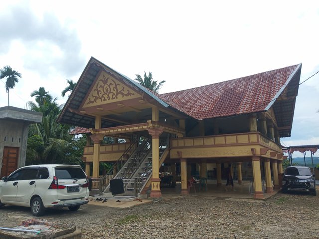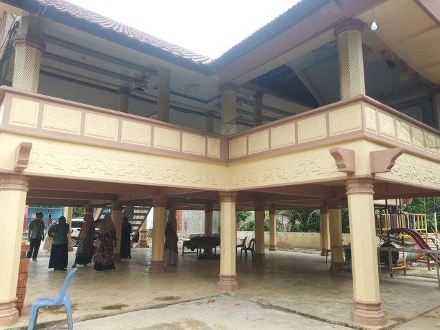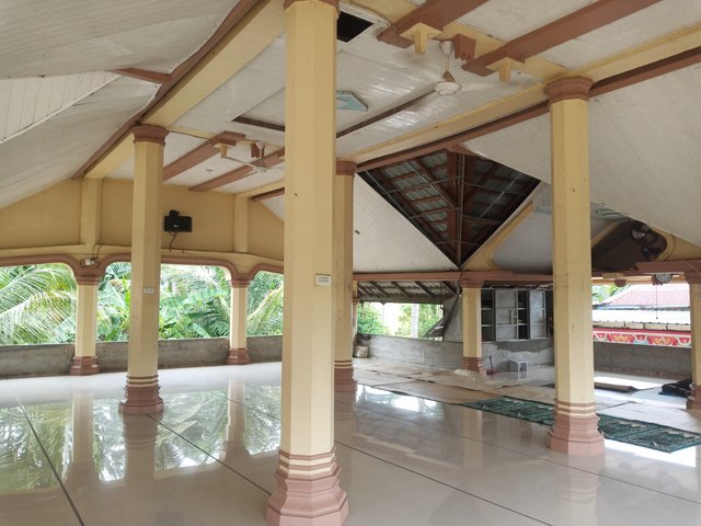 Fasad bangunannya terkesan tradisional. Sekilas saya teringat akan bentuk rumah adat Aceh yang berbentuk panggung. Memang, beberapa meunasah di daerah ini memiliki bentuk yang serupa dengan meunasah ini. Memiliki banyak tiang penyangga besar menopang lantai atas sekaligus menjadi ruang utama meunasah ini.