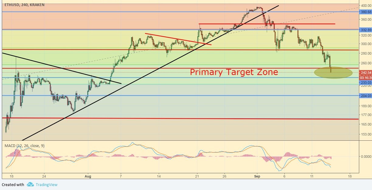 Ethereum is hit even harder, trading nearly 40% below the price levels of early September, although the backbone of the ICO boom failed to reach its June high during the recent rally.The ETH token is now trading right in our target zone for the market correction that we have been expecting in recent weeks.
