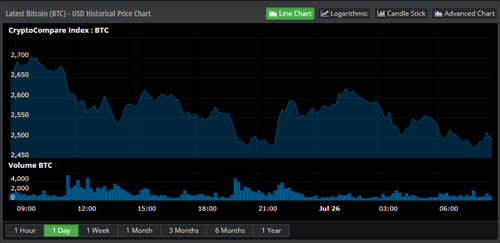 As a result of the upcoming UAHF, investors have become concerned given the possibility of replay attacks and general malfunctions on the network. As a result, Bitcoin is down 6.67% in the last 24 hours to $2,499.59 with roughly $519M exchanged on the USD pairs.