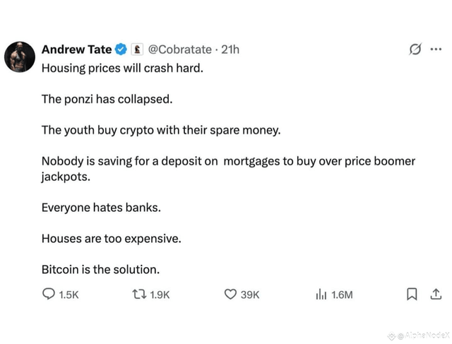 According to Tate, housing prices are heading for a serious crash, and young investors are turning their eyes to crypto instead. 🏠⬇️➡️💎