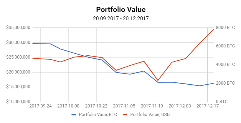 The growth of SPIES price since its inception on 9 May, 2016, is 14925.5% in US dollars and 301.5% in BTC. The portfolio grew from $47,382 to $34,463,261 during this period. The status of the portfolio in real time can be monitored in the fund’s profile on cyber•Fund.