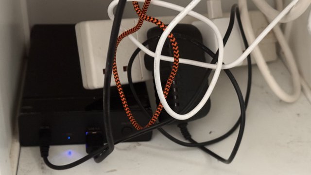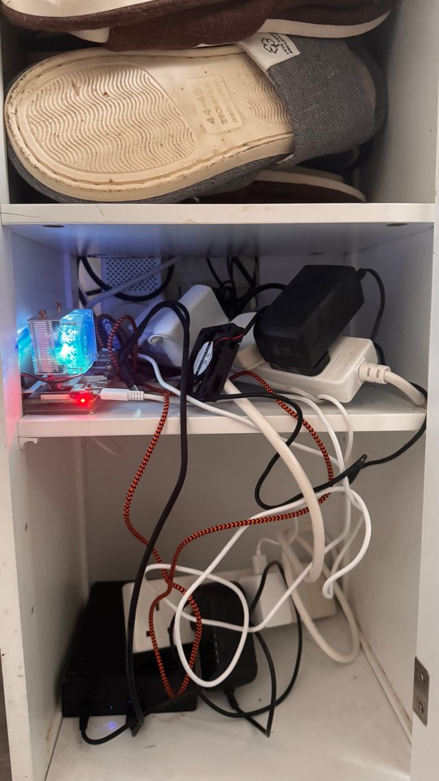 The first step is to connect the hard drive to the Raspberry Pi via USB. It requires an external power supply. I found a socket that could barely fit two plugs in the small shoe cabinet: one for the 3.5-inch hard drive enclosure and the Raspberry Pi 4B.