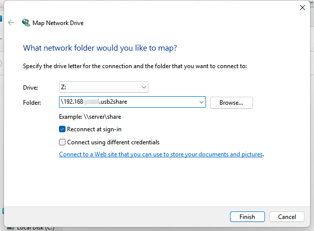On Windows, right-click “This PC” → “Map network drive” and enter the address: