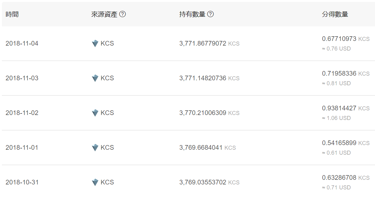 幣圈行情不好,已經完全沒有人在提 KuCoin 了,甚至 OKEx 的 OKB 以及 FCoin 也都沒人在提了,這我都知道。但是我更知道的是,現在的進貨成本低到每一個 KCS 幾乎只要一美元,這是前所未有的低價,非常值得賭一把。尤其,你看下面這張表是我的最後五天的收益,最差的那天 (2018-11-01),換算成年報酬率的話,也有 (0.54165899/3769.6684041)*365 = 5.24%,相當的不錯哦。