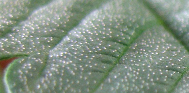The undersides of the leaves are gloriously healthy. The dots don't rub off, but after brushing against a few leaves, my finger feels sticky like a piece of tape. The trichomes are here! :D