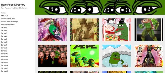 Description: Rare Pepes are unique illustrations and photoshops of the character Pepe the Frog which are ostensibly valued [on the CounterParty blockchain] as if they are trading cards based on their relative saturation on the web. After a collection was posted for sale on eBay in March 2015, Rare Pepes have been frequently listed by users on other online marketplaces.