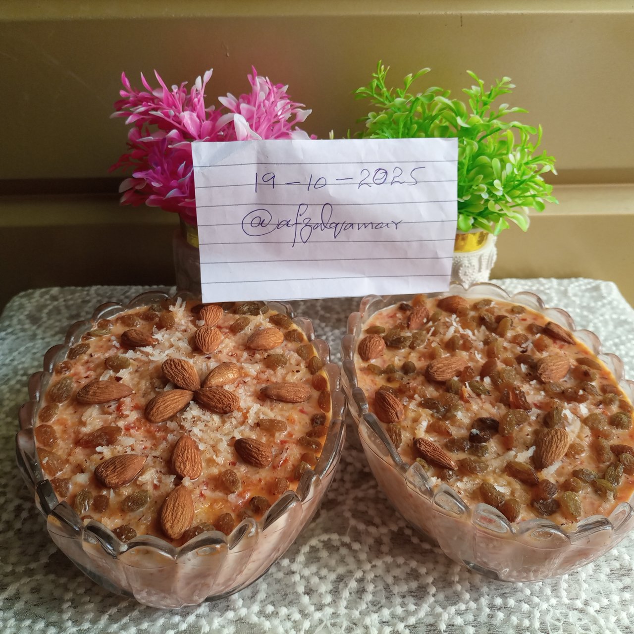 Now the delicious milk carrot halwa was ready. I have arranged coconut, raisins and almonds on it to enhance its beauty. You can see in the picture how I decorated it with these things.
