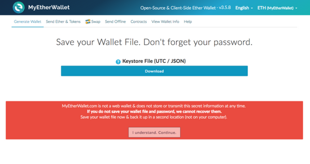 Click on the “Download” button. You just have downloaded a copy of your wallet on your computer. Now store this file securely. Read the important message carefully, then click on the “I understand. Continue” button.