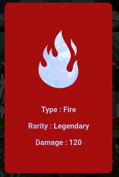 Here is a red color card, its type is fire, its reality is legendary and its damage is 120. This is the highest damage card. I have not seen any card with more damage than this. Its damage is 120, which means that it can give us the maximum to defeat the monster and we can win.