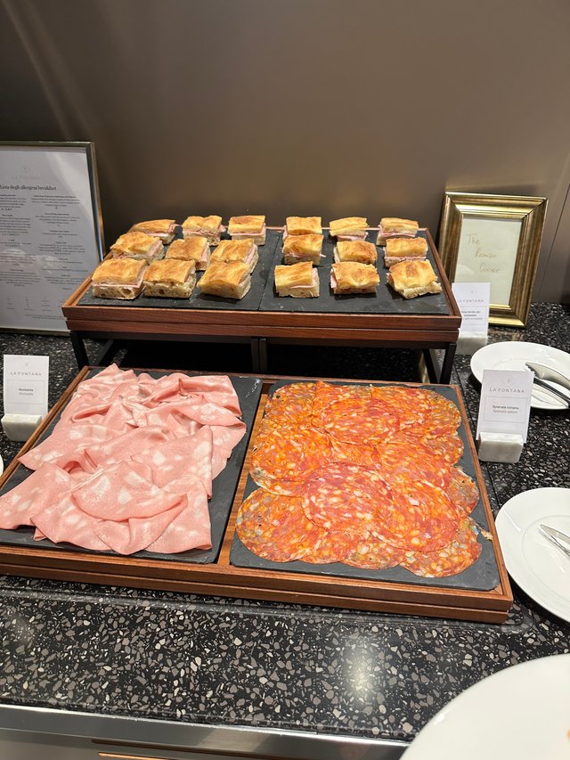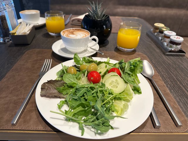我想着按照健康吃法的方式,先吃蔬菜纤维类,于是先拿了盘沙拉。某生说他才不要呢,早餐哪里有吃沙拉的。他直接就冲向主食,糕点类。这里的芝麻菜/或者火箭菜真是好苦呀。比起在美国吃的要苦很多。不知道什么原因?难道越苦越有营养?第一道菜吃苦确实有点不适。
