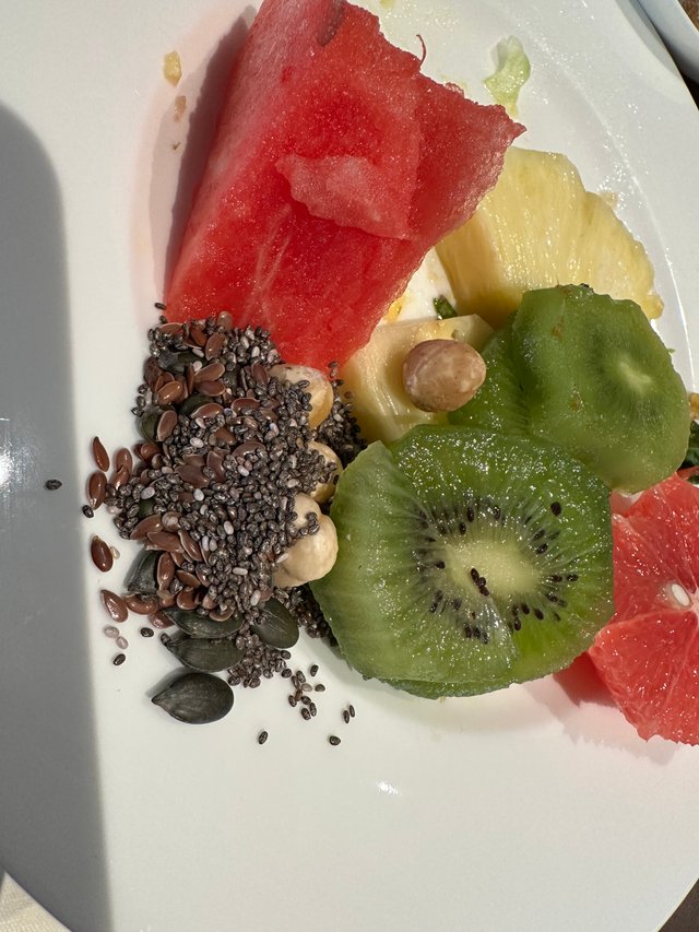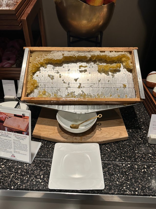 这里的早餐居然有蜂巢。直接把整板的蜂巢放出来给客户使用。我好奇挖了一小块尝。之前在麻省的时候,在超市里有买过一次。但是,吃起来最后跟嚼蜡一样,只吃了一口,就全部丢掉了。我想着这里应该也一样。但是好像没有那么严重的蜡。只是有了之前的经验,这次嚼起来没那么使劲,吸了蜂蜜就丢在一旁。我把照片给家里的兄弟们看。哥哥说这里的蜂蜜没有国产的好!