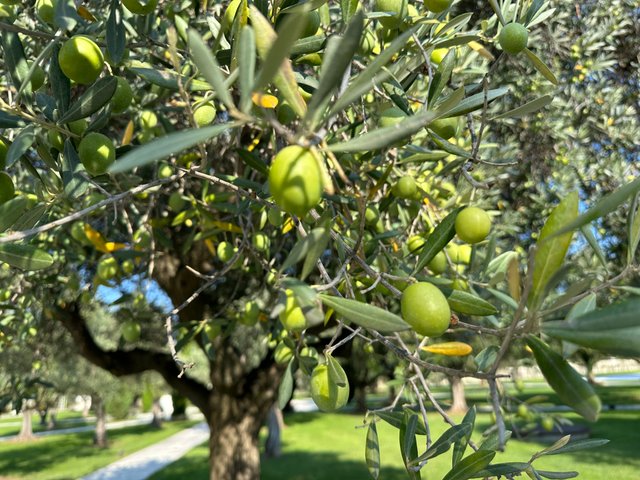 酒店小岛的中央还有个教堂。四周有不少橄榄树。看到不少橄榄都已经黑透了。我就想着摘下来尝尝味道。好家伙,这真是好涩呀。压根不能吃。跟国内的那种青橄榄的品种真是差太多了。我手机拿出来搜了一下,发现这里的橄榄是需要处理后才可以吃的。原来我们在超市里看到和买回家那么好吃的橄榄都是经过后处理的。