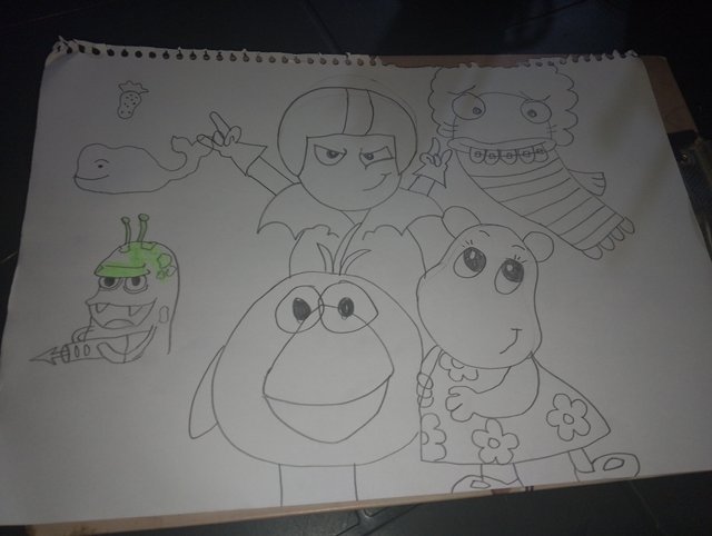 Mas tarde después de comer le dije a mi primo menor que me buscara una hoja que iba a realizar unos dibujos luego tome un lápiz y comencé a dibujar, el me dijo que le hiciera un dibujo para ver si yo podía o no igualarlo así que lo hice y le gusto, también realize otro dibujos de mi preferencia y me dijo que no sabía quien era esa yuniqua y que estaba fea y se la paso todo el rato fue burlándose diciendo (que es eso?), quise hacer dibujos animados por que sé que los podía identificar y que le gustarían aunque no me salieron muy bien por qué los hice algo apresurada.