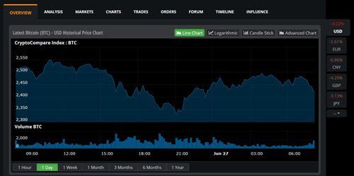 Bitcoin is down 4% at $2,420.12 with a volume of Ƀ 166,989 - $400m on the USD pairs.