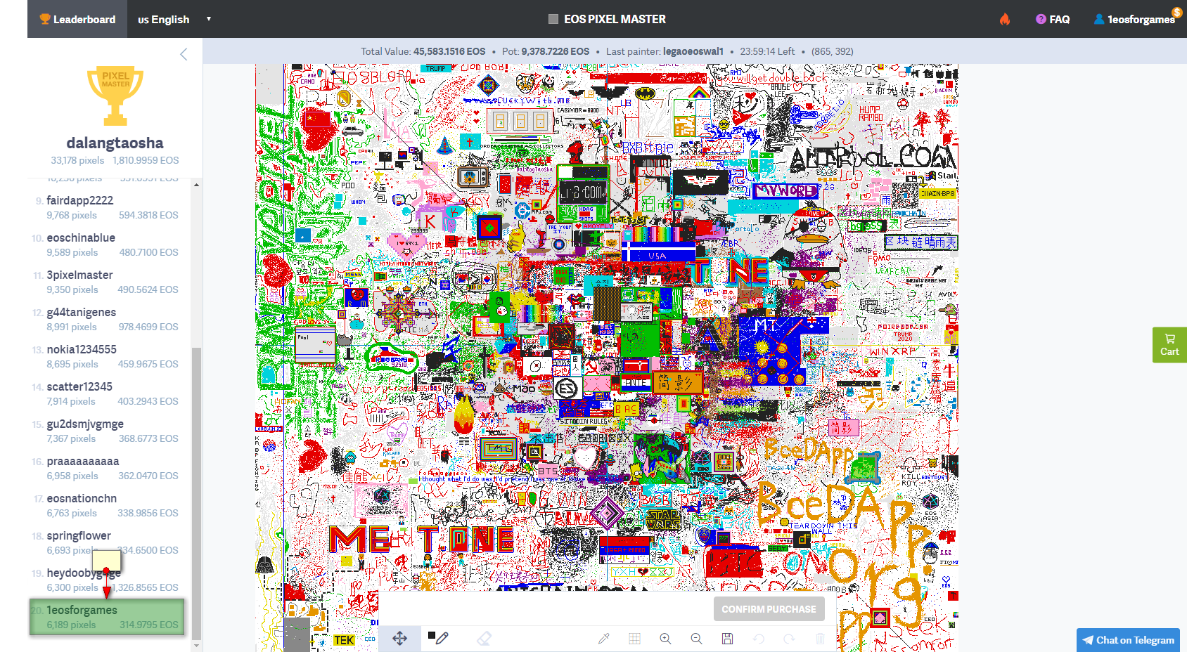 My EOS account is 1eosforgames and have succeeded for a short time to be among Top 20 pixel owners.