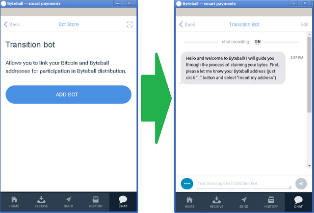 Der Bot öffnet den Chat sofort mit folgender Meldung: > Hallo und willkommen bei Byteball! Ich werde Dich durch die Prozedur leiten, die nötig ist, damit Du Deine Bytes erhältst. Zunächst benötige ich Deine ByteBall Adresse (einfach auf den "..."-Button klicken und "Insert my address" wählen).