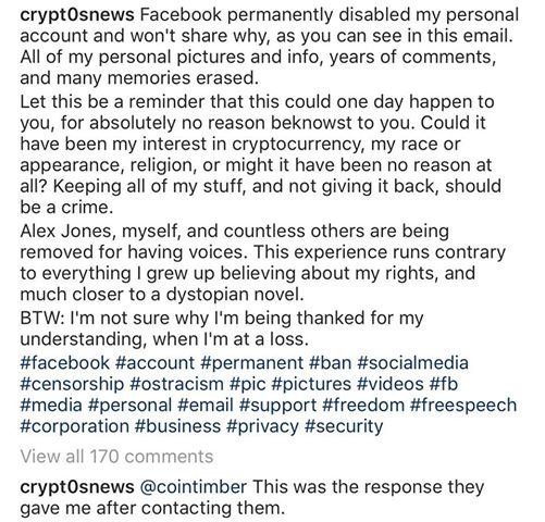 This is @crypt0snews and all the people who think like that (this is not an insult by the way, its a warning) you say "Keeping all of my stuff, and not giving it back, should be a crime". I agree, BUT I'd bet if you read the "license agreement" or whatever they called it (that I'm 99.9999975% sure you didn't read. I know I didn't), that "stuff" was no longer yours when you pressed the Enter key to post it. Example, cell phone "Owners Manuals" are now called "User Manuals" because in the fine print that no one ever reads we are not purchasing any rights of ownership, were just "users" of the service(s).