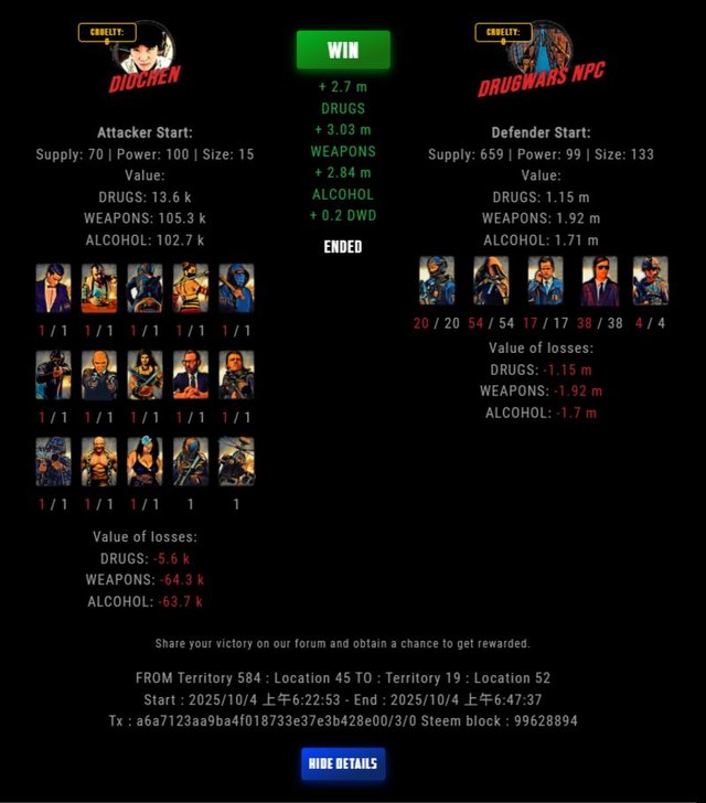 Check my latest fight ! diochen vs The Govermentdiochen (73)in DrugWars • 12 days ago #drugwars-fight #gaming #fight #dw
