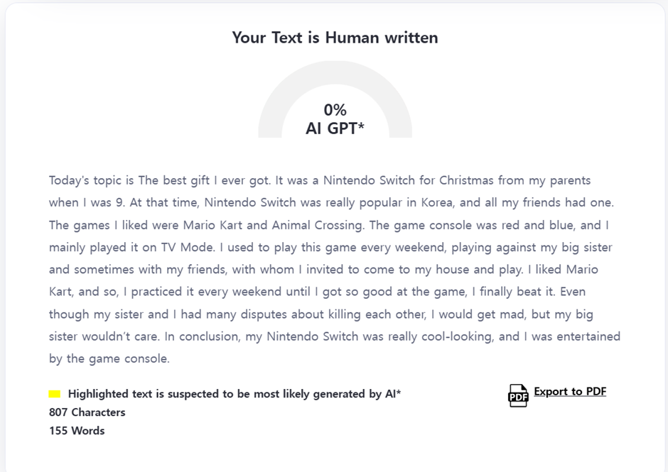 Today's topic is the best gift I ever got. It was a Nintendo Switch for Christmas from my parents when I was 9. At that time, Nintendo Switch was really popular in Korea, and all my friends had one. The games I liked were Mario Kart and Animal Crossing. The game console was red and blue, and I mainly played it on TV Mode. I used to play this game every weekend, playing against my big sister and sometimes with my friends, with whom I invited to come to my house and play. I liked Mario Kart, and so, I practiced it every weekend until I got so good at the game, I finally beat it. Even though my sister and I had many disputes about killing each other, I would get mad, but my big sister wouldn’t care. In conclusion, my Nintendo Switch was really cool-looking, and I was entertained by the game console.