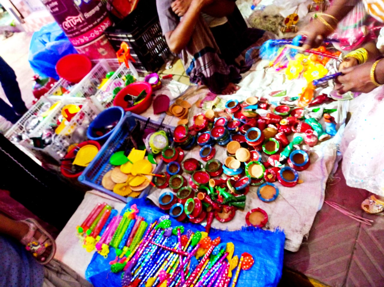 প্রথমে দেখতে পেলাম এক লোক বাচ্চাদের খেলনা নিয়ে বসেছে নানা রকমের খেলনা রয়েছে সেখানে। প্রতিটি খেলনা আমার ছোটবেলার স্মৃতিকে মনে করিয়ে দিল। ছোটবেলায় বাবার সাথে এরকম ছোটবেলায় যেতাম এবং প্লাস্টিকের নানা রকম খেলনা কিনে বাড়ি ফিরে আসতাম তখন অনেক মজা হত। হাজার চাইলেও আজ সেই ছোটবেলায় ফিরে যাওয়া সম্ভব না।