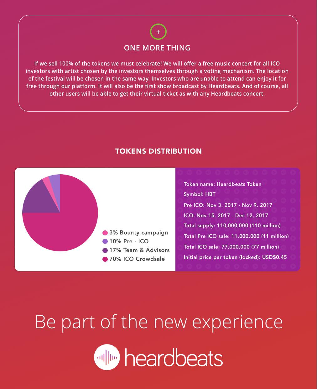 Tokens sold during the Pre-ICO and the ICO represent 80% of the total tokens. The remaining 20% will be split between the Heardbeats Team and advisors (17%) and the bounty campaign participants (3%).