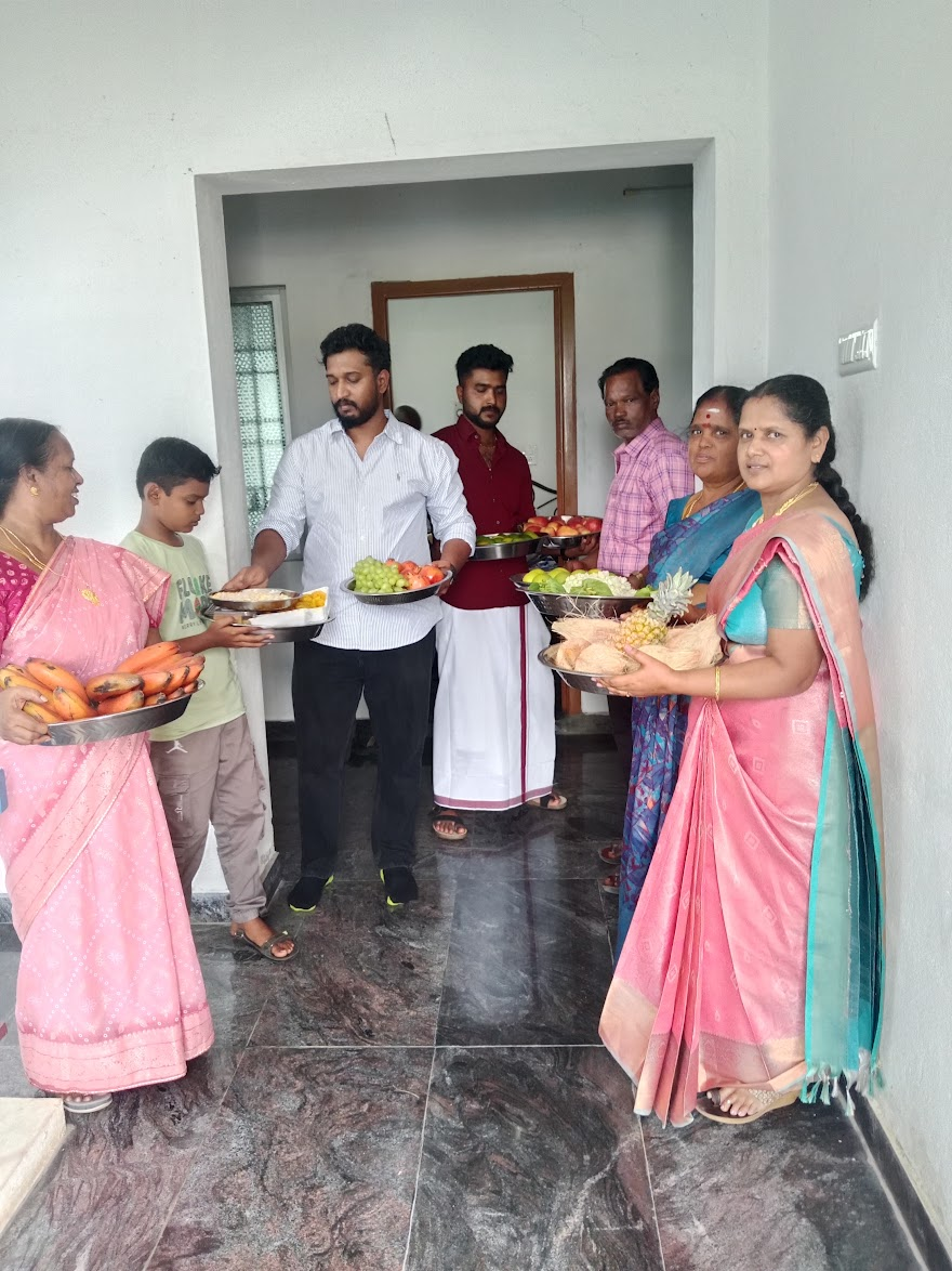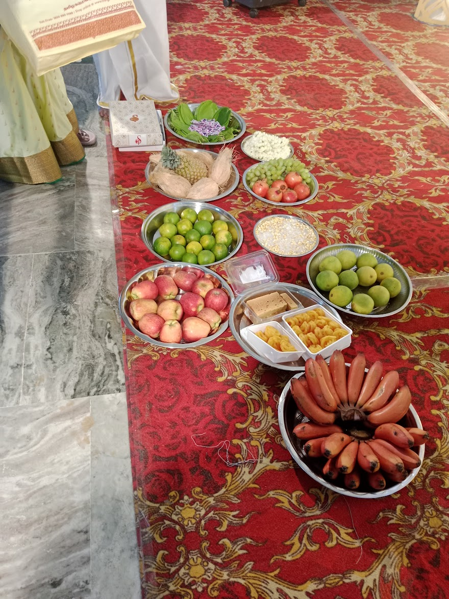 We went to the hall where the function was to be held two hours before. There, many items were placed on trays to give gifts to the children who were going to have an earring ceremony. There were fruits, flowers, grains, clothes, gold jewelry, sweets etc. Each relative carried everything in their hands and went in a procession to the stage where the ceremony was to be held. I also carried a tray and went there and placed it there.