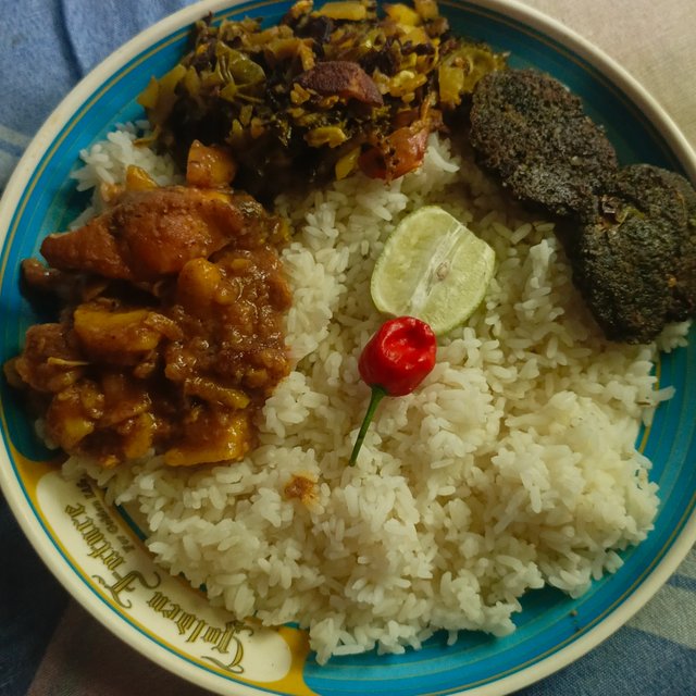 Then I finished cooking, I took the food from the kitchen one by one to the dining room and left the cars" Afterward, I had lunch after having a bath. Today's lunch was white rice, dal, big gourd, fried fish, potatoes, bell peppers, lemon and a Bombay chili.