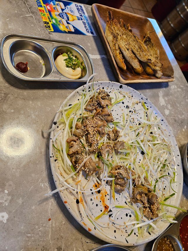 The second round was at a famous restaurant serving grilled skate. We had soju, some golbaengi (golbaengi), and grilled skate. The grilled skate was plump and delicious, not dry.