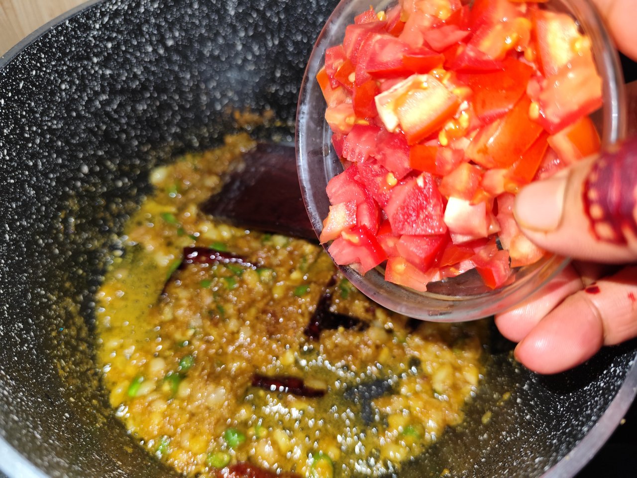 √ Once the raw smell of the spices has faded, add the chopped green chilies, a little turmeric powder for color, coriander powder, and chopped tomatoes. Then stir all the ingredients together and cook for two minutes.
