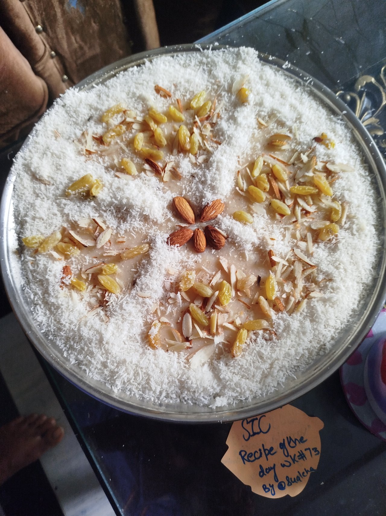 Now it's time to decorate on top of my yummy dessert for that again garnish with coconut dust , raisins and crushed or fine cut almonds on it as you see in images it's final step of the recipe.