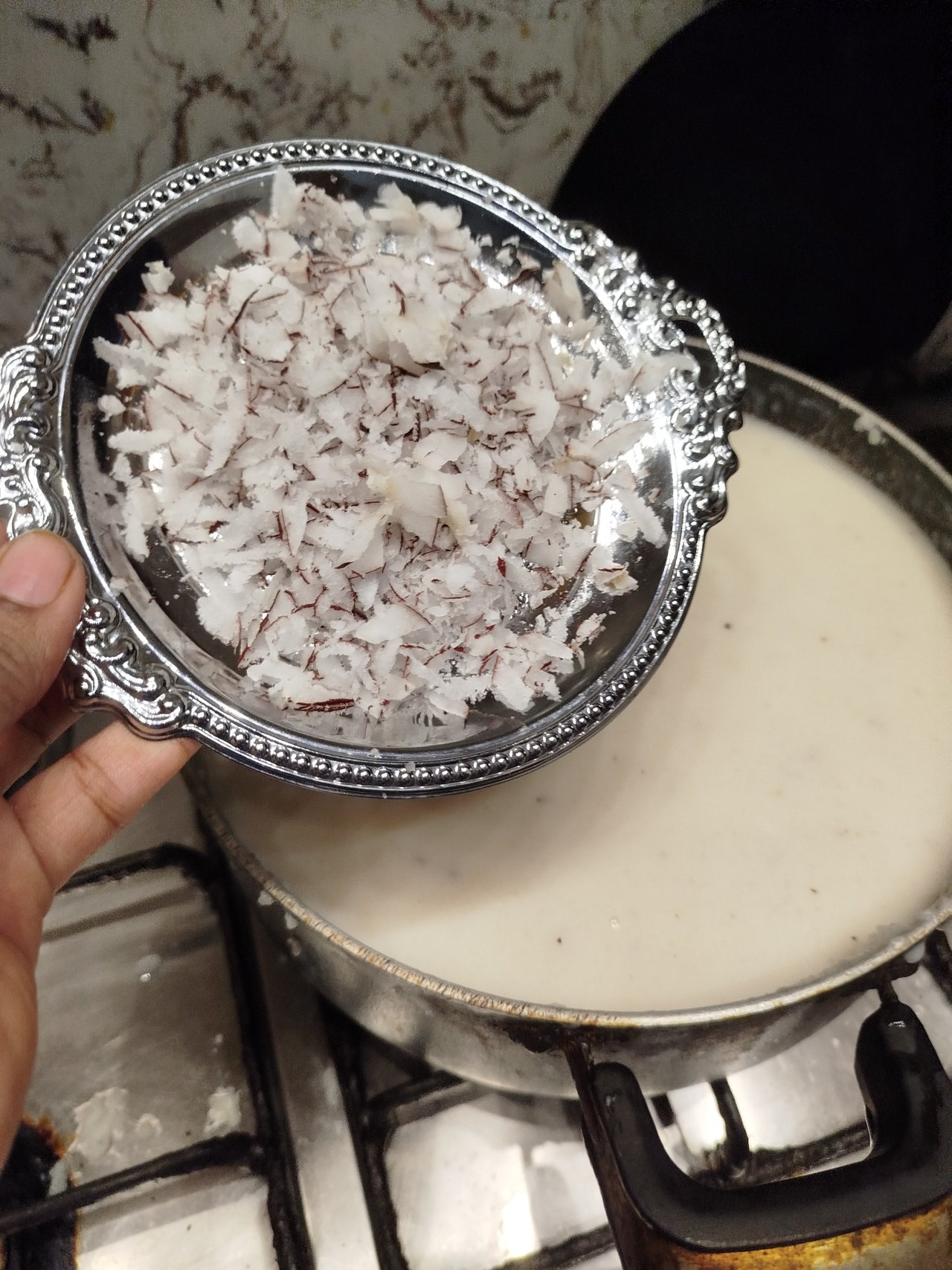 When I got the perfect consistency of rice pudding I just damp low the flame spread crushed almonds and grated coconut 🥥 on top for more rich and sweet flavor .If you like you can add any dry fruits as per taste .