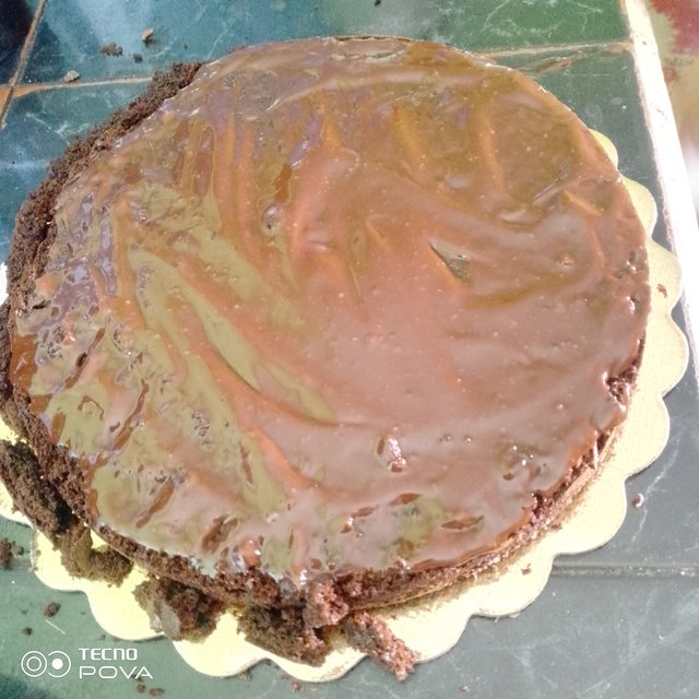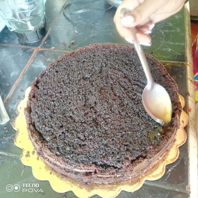 Mientras el bizcocho reposaba ella almorzó y enseguida se puso a batir el ganache, la crema de chocolate con la que iba a rellenar la torta y a cubrir, lo dejo reposar un rato en la nevera para que agarrara consistencia, después procedimos a picar el bizcocho y echarle un almíbar de café, para rellenar con el ganache.