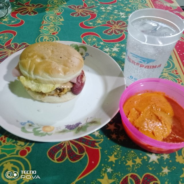 Para culminar éste día especial, pero de mucha tensión jajajaja cerramos el día un una rica hamburguesa preparada aquí en casa, con carne, chorizo, jamón, queso, tomate, cebolla caramelizada y salsa yo acompañe la mía con salsa de pimentón que tenía en la nevera.