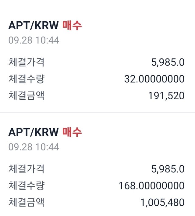 [앱토스 돈쭐내기] 2025.09.28. APT 추매, 수익률 -8.4%steemCreated with Sketch.lucky2015 (84)in Korea • 한국 • KR • KO • 6 days ago 보유량 : 4,700개 평균가 : 6,539원 수익률 : -8.4% 2025년 09월 28일, APT 200개 매수 [앱토스 돈쭐내기] 2025.09.21. APT 추매, 수익률 -1.5% [앱토스 돈쭐내기] 2025.09.14. APT 추매, 수익률 -1.6% [앱토스 돈쭐내기] 2025.09.07. APT 추매, 수익률 -10.2% [앱토스 돈쭐내기] 2025.08.31. APT 추매, 수익률 -7.7% 2025.09.28. #kr #krsuccess