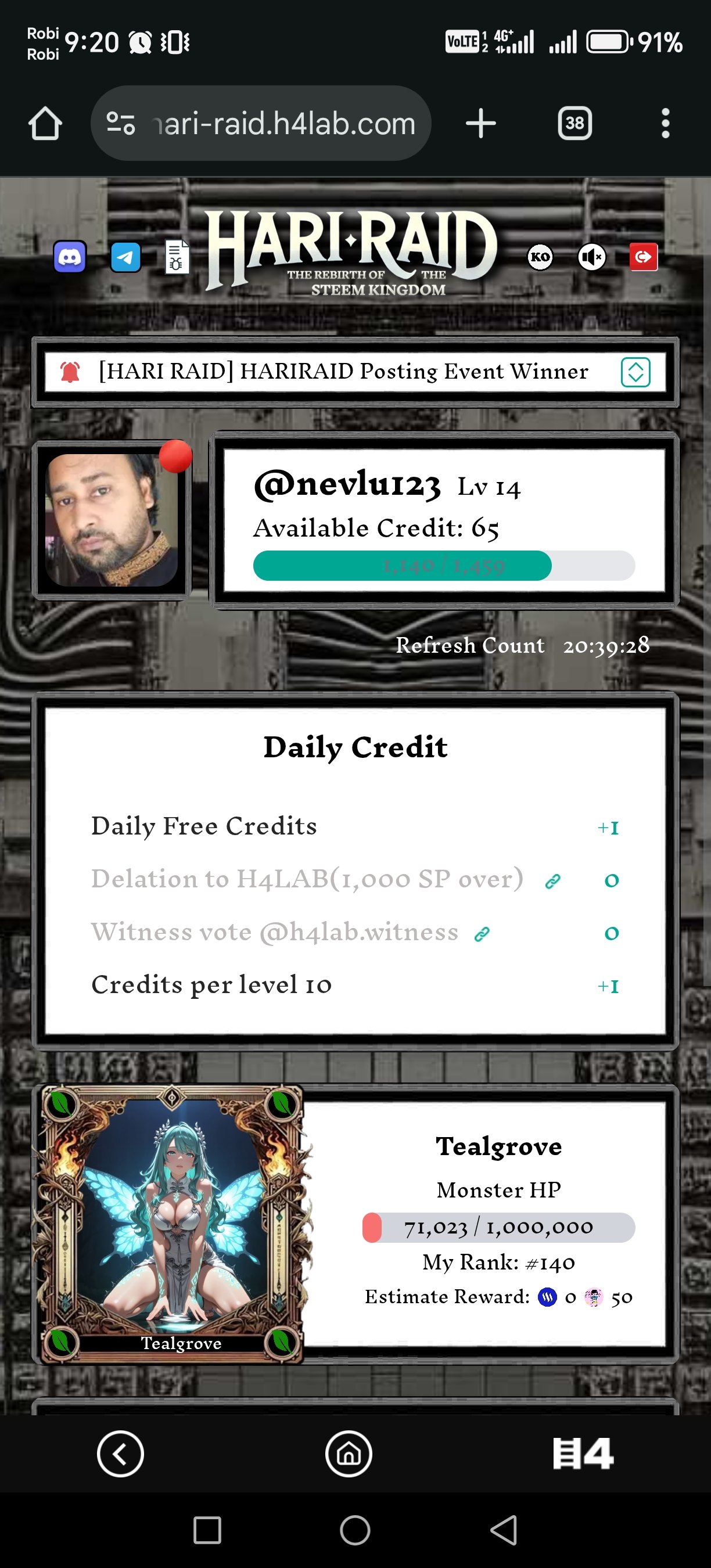 Today my level was 14 also cradit was 65 also monster hp 71023/1000000.Also i claim 10 points.