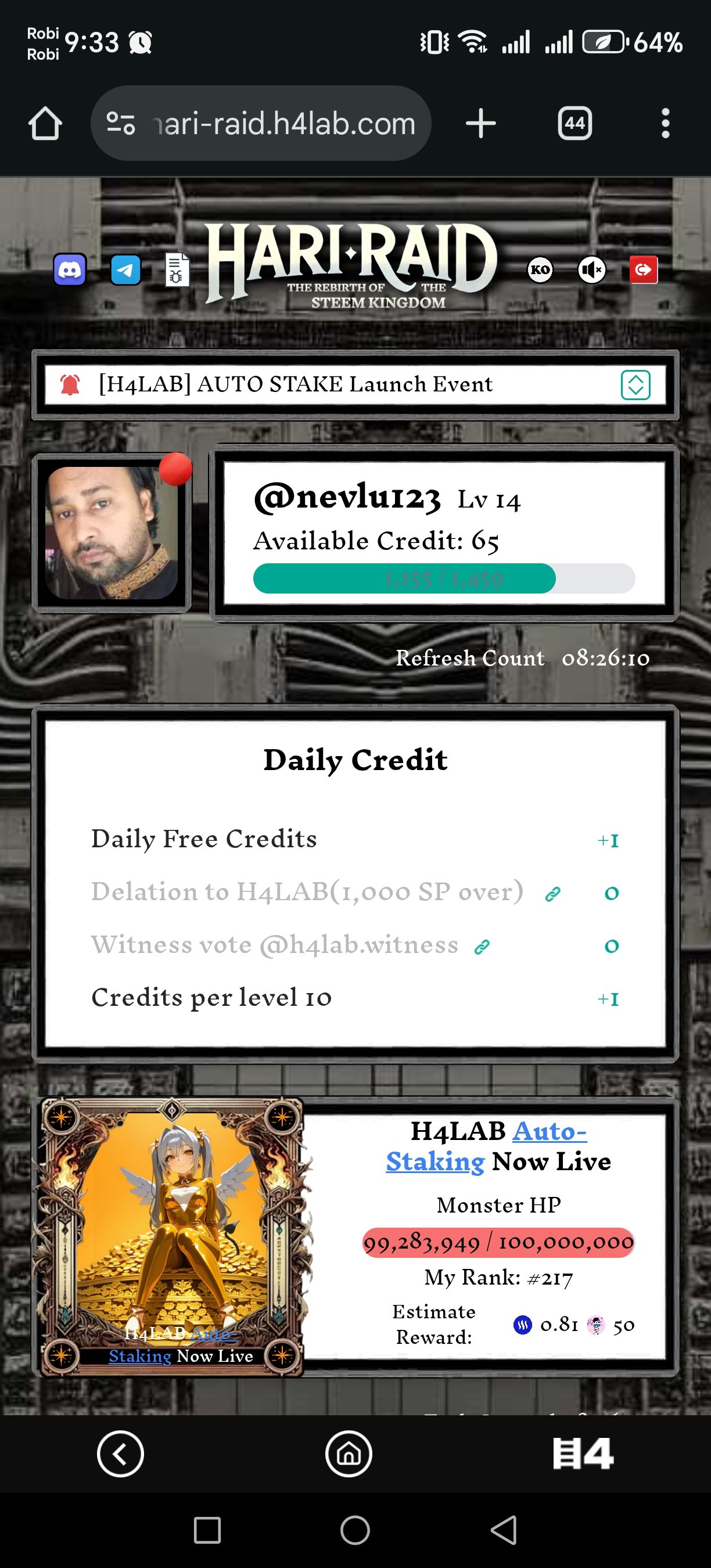 Today my level was 14 also cradit was 65 But also today monster hp was 99283949/100,000,000.