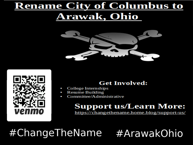 We can no longer stand promoting a genocidal sex trafficker and living in an area dedicated to his piracy. This movement seeks to change the name of Columbus, Ohio, to Arawak, Ohio for the people, Christopher Columbus, genocided, enslaved and child slave trafficked. Any funds beyond needed to change the name will be used to build community and increase discussion of the continuing caging of human beings for non violent conduct.