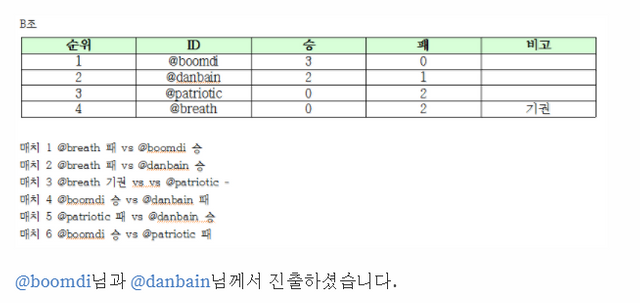 4강에 진출하였고 A조 2위인 @vimva 님과의 혈전 끝에 가까스로 승리를 거두고