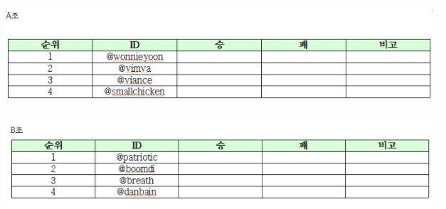 여기서 4명씩 나뉘어 A조와 B조로 나뉘어 조별풀리그 방식으로 진행이 되고