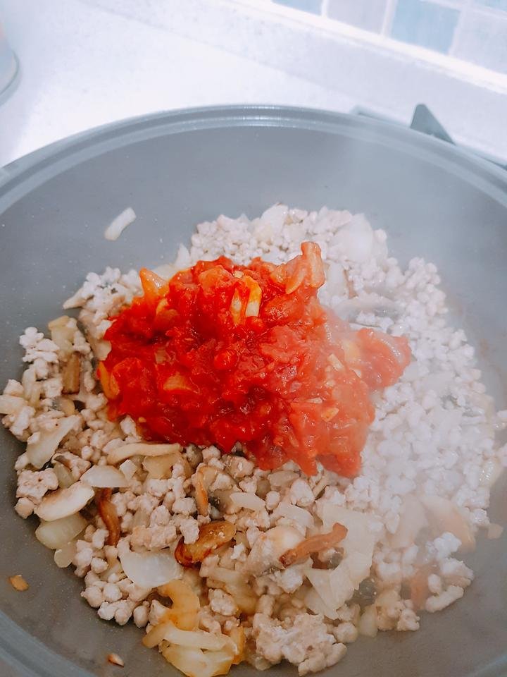재료: 수제 토마토소스, 양파(반개), 마늘, 소금, 간장, 토마토케첩, 양송이버섯, 간 돼지고기