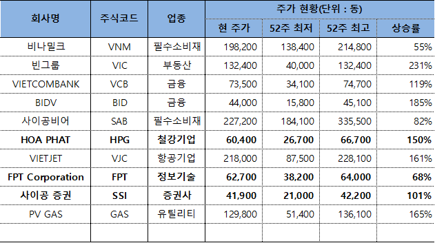 베트남 대표기업 10선과 국내 비교기업의 주요 재무정보와 52주간의 주가 현황을 아래 테이블에 정리해 보았습니다.