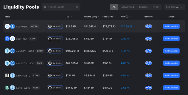 일단 지원하는 유동성 풀 중에 2x Bricks 보너스를 받을 수 있는 풀에 넣으면 되는데 APR 은 SUI-USDC 풀이 압도적으로 높긴 하지만 이미 스테이블은 다 여기저기 잠궈두고 채굴중인데다 뭐 오래 넣어둘 건 아니기도 하고 보통 가격 레인지가 설정값을 벗어나기 일쑤이다보니 장기적으로 별 이득을 못보는 경우도 많아서 SUI 홀더 입장에서 맘편하게 xSUI - SUI 풀에 담았습니다.