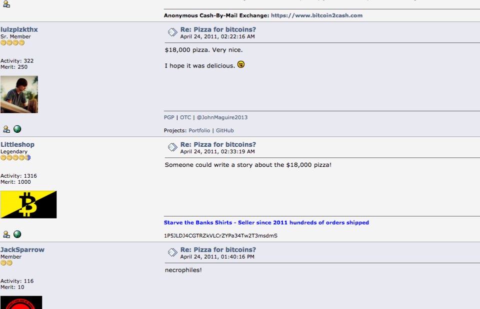 거래가 성사된 뒤 비트코인 포럼은 축제의 분위기! 이날을 비트코인으로 피자를 사 먹은 날 즉 피자데이 로 지정합니다.ㅎㅎ