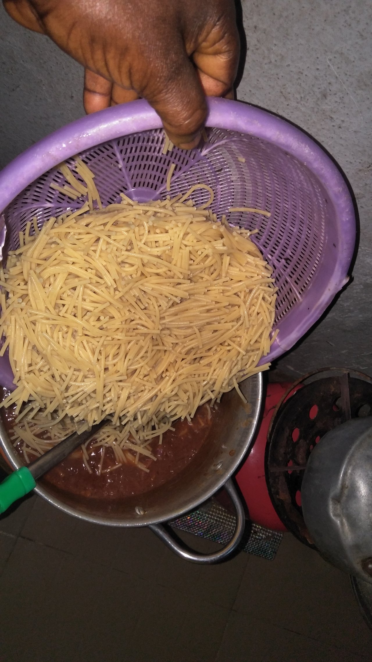 With the ingredients ready, I heated the Groundnut oil in my cooking pot, then added the prepared ingredients one by one. Finally, I added the drained spaghetti to the pot, stirring everything together to ensure the ingredients combined perfectly.